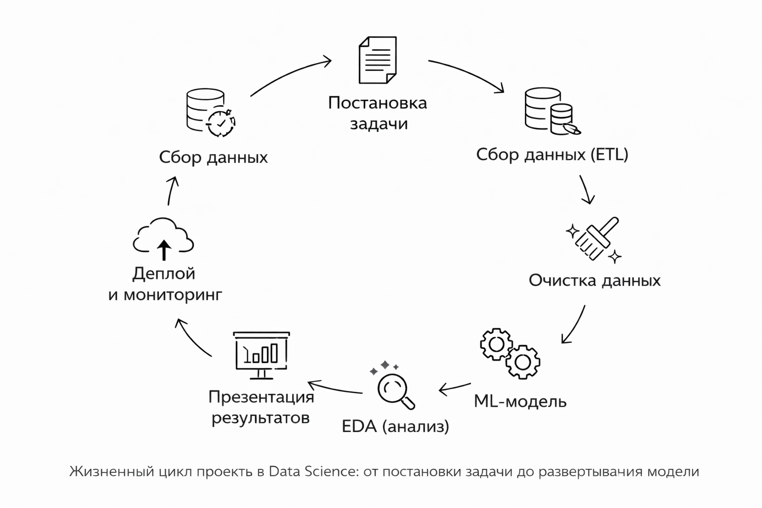 Рабочий процесс специалиста по данным — это не просто написание кода. Это комплексный цикл, который превращает бизнес-вопрос в работающее технологическое решение.
