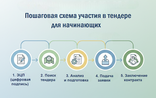 Участие в тендерах может показаться сложным и запутанным, особенно на первом этапе. Однако на практике весь процесс укладывается в понятную последовательность шагов, которые повторяются из процедуры в процедуру. Если действовать системно и соблюдать требования документации, участие в тендерах становится предсказуемым и управляемым процессом. Ниже представлен базовый пошаговый план, который поможет начинающим участникам уверенно пройти путь от регистрации до заключения контракта.