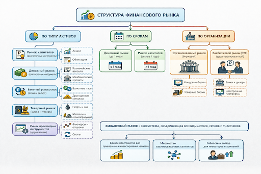 Финансовый рынок состоит из множества сегментов, которые можно классифицировать по разным признакам. Это помогает лучше понять его устройство и ориентироваться в инструментах.