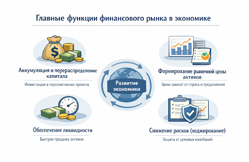 Финансовый рынок выполняет ряд критически важных функций, без которых невозможно нормальное развитие современной экономики. Каждая функция решает конкретную задачу и обеспечивает эффективное движение капитала.