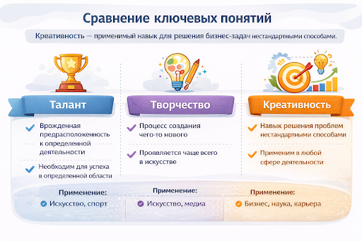Важно понимать различие между этими понятиями. Талант — это врожденная предрасположенность к определенной деятельности. Творчество — это процесс создания чего-то нового, чаще всего в искусстве. Креативность же — это навык решения проблем нестандартными способами, применимый в любой сфере деятельности, от бизнеса до науки.
