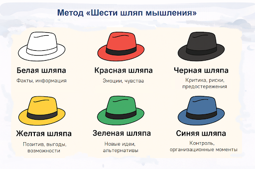 Методика предполагает последовательное рассмотрение задачи с разных позиций. Каждый тип мышления условно обозначен цветной «шляпой», что помогает структурировать обсуждение и избежать хаоса в идеях.