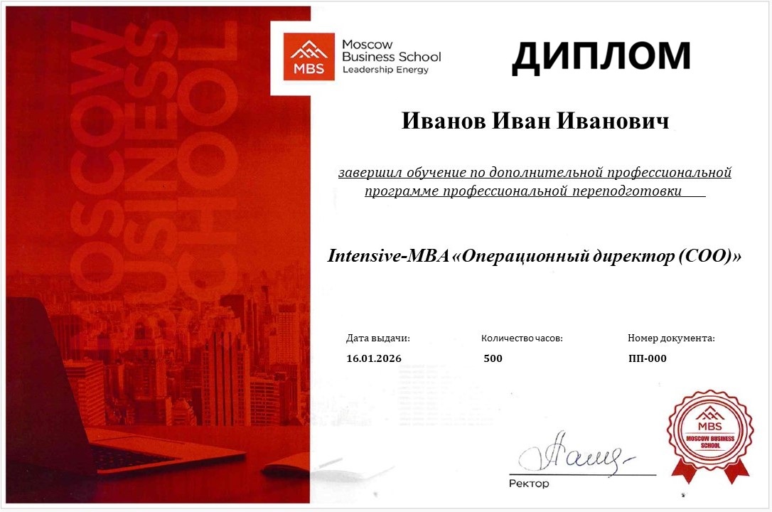 Включает 6 модулей в области управления. По окончании выдается диплом о профессиональной переподготовке в области менеджмента. Срок обучения: 8 месяцев.