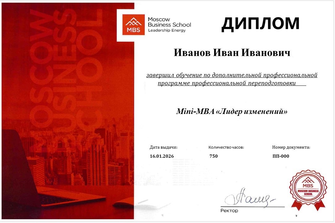 Включает 6 модулей в области управления. По окончании выдается диплом о профессиональной переподготовке в области менеджмента. Срок обучения: 8 месяцев.